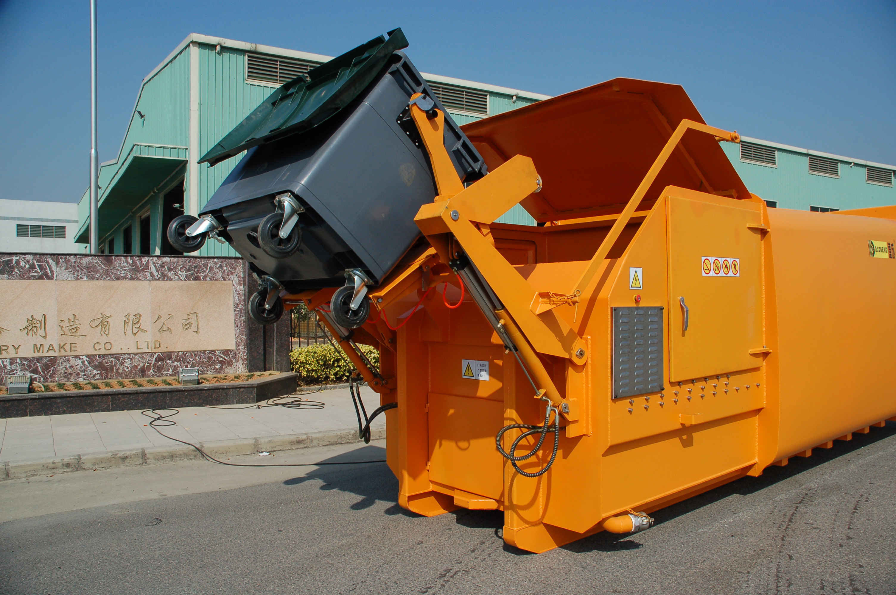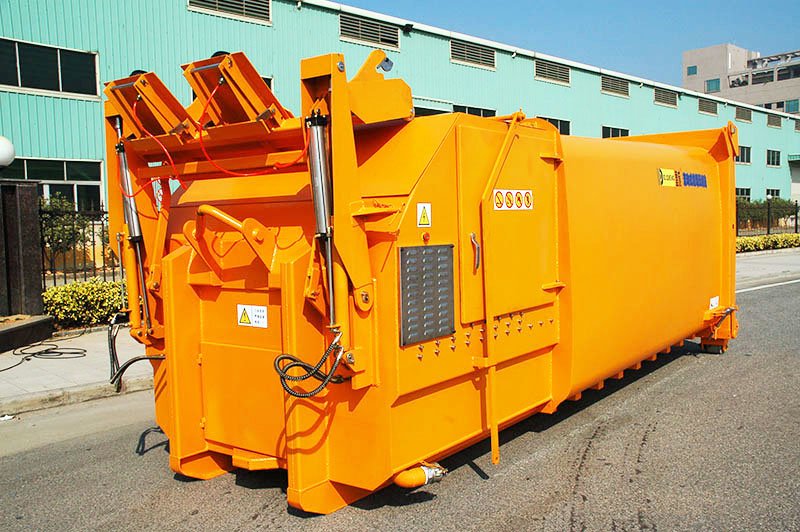 ? ? ? ?達(dá)成掛斗式連體垃圾壓縮箱是壓縮機(jī)和箱體合二為一的連體機(jī),投料口的密封蓋與翻斗架實(shí)行聯(lián)動(dòng),垃圾倒 入投料后,投料口密封蓋立即自動(dòng)閉合,從而保證垃圾和灰塵不外溢,掛斗式的翻斗架適用于國(guó)際通用的120L·1100 雙輪、四輪垃圾收集桶。