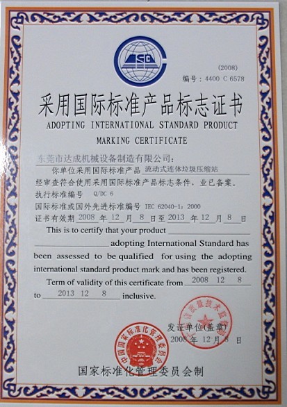 垃圾壓縮站國際標(biāo)準(zhǔn)證書